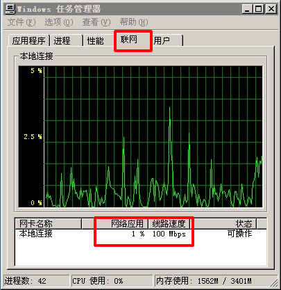 在服务器托管到机房后,您可以远程登入服务器. 测试下载大文件. 然后查看您本机的带宽使用情况,就可以了解您本机正使用了多少带宽. A: 广东电信机房测试(如果服务器在广东 这个测试非常准确): 从avl.com.cn 下载 http://benchmark.avl.com.cn/cab/avltool.exe 测试工具. 在服务器运行这个工具. 点击 测试网站速率 然后在"开始"->"运行", 输入 "taskmgr",出现 window任务管理器, 选择 "联网" 就可以看到 服务器带宽占用情况.以下图为例,表示带宽是 1M带宽 (0.01*100).