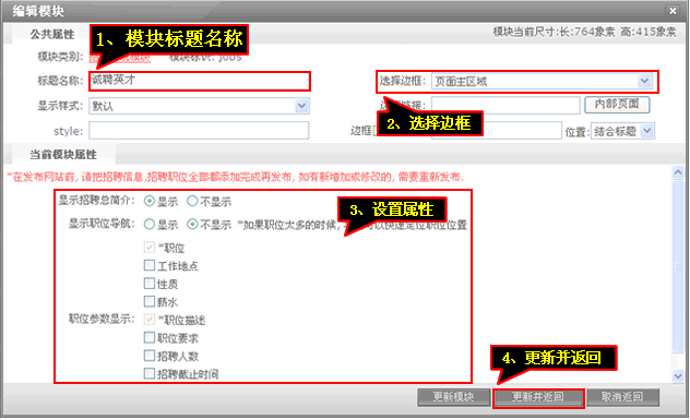7、输入模块标题”设置“相关属性”后点击“更新并返回